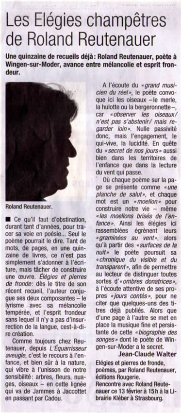 Roland Reutenauer écrit bref, sangle ses mots, insuffle à ses poèmes une tension remarquable. S'il ne fait pas bâiller ses vers, ni s'étirer son propos, c'est parce qu'il demeure dubitatif : qu'attendre de ce langage tant et tant utilisé, qu'espérer d'un vocabulaire si souvent mis à contribution, pourquoi, encore et toujours, inventer de nouveaux discours, alors que la nature, la lumière, les bruissements parlent si bien eux-mêmes ? Reutenauer évoque, de page en page, les couleurs de cette Alsace que son regard interroge quotidiennement, comme pour affirmer : peut-être ce poème dira-t-il ce que le précédent n'a point dit... Et finalement, au terme du chant, à la fin de l'effort, il reste quelques lettres accrochées, quelques mots qui "nous apprennent à vivre et à mourir, la gorge serrée sur des cailloux aveugles", et ce mystère qui ne loge en aucun dictionnaire.
