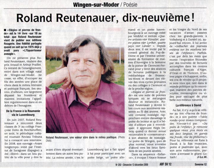 ... Il y a chez ce poète discret, mais reconnu par ses pairs (Prix Artaud 1979) une volonté d'intime cohérence : acte de vivre et acte d'écrire se confondent... Roland Reutenauer est de ces poètes qui préparent l'avènement non de cette mauvaise littérature envahissante, mais d'un véritable univers d'une parole totalement signifiante...