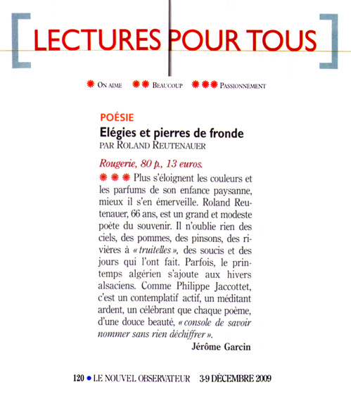 Loin des milieux littéraires, avec discrétion, Roland Reutenauer publie des recueils qui sont pourtant parmi les plus délicieux d'aujourd'hui... Cet élégiaque ne quitte pas les pelouses civilisées des sentiments furtifs et délicats. Il lui suffit pourtant de quelques syllabes à mi-voix pour accéder au surnaturel, comme si par une musique à la Schubert il annexait, sans peine, une subtile magie. Il faut beaucoup attendre de Roland Reutenauer.