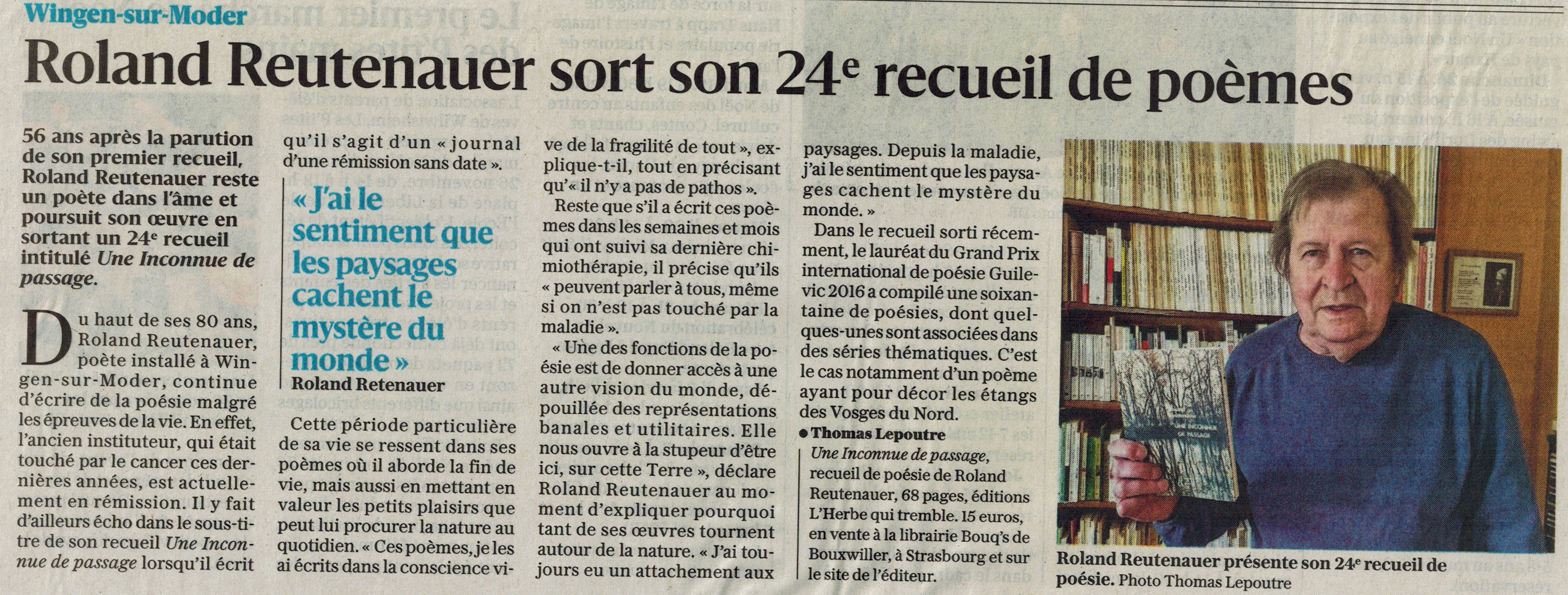 Le Rhénan Roland Reutenauer est un poète comme on les aime, dont chaque vers, chaque visage, chaque souvenir, chaque émotion, chaque image, ciselée à l'or fin, "à quelqu'un veut sourire".