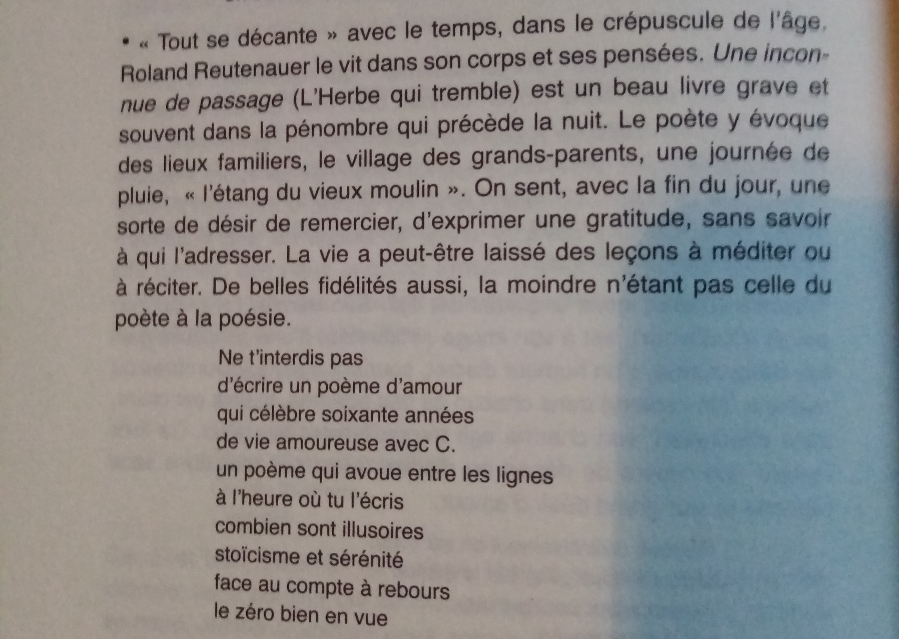Ceux qui lui sont fidèles savent que Roland Reutenauer continuera, comme par le passé, à rester « sensible au pouvoir d’évocation des mots, à leur beauté et à leur mystère ». C’est qu’il préfère toujours le poème au bavardage et à la logorrhée !