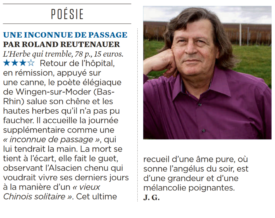 Plus s'éloignent les couleurs et les parfums de son enfance paysanne, mieux il s'en émerveille. Roland Reutenauer, 66 ans, est un grand et modeste poète du souvenir. Il n'oublie rien des ciels, des pommes, des pinsons, des rivières à "truitelles", des soucis et des jours qui l'ont fait. Parfois, le printemps algérien s'ajoute aux hivers alsaciens. Comme Philippe Jaccottet, c'est un contemplatif actif, un méditant ardent, un célébrant que chaque poème, d'une douce beauté, "console de savoir nommer sans rien déchiffrer".