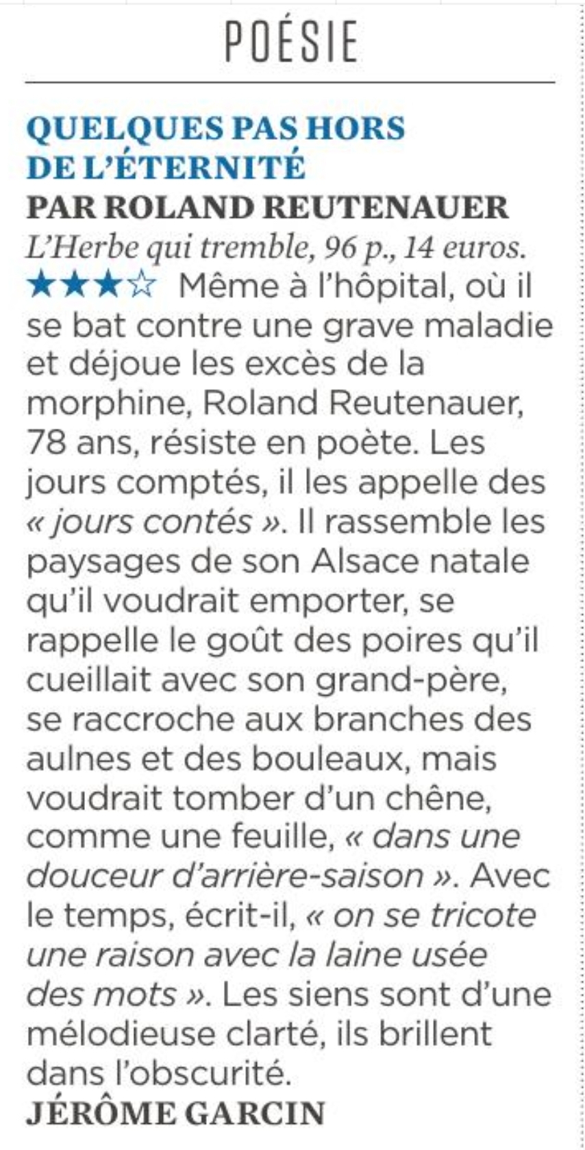Si la poésie c'est une manière de vivre avant d'être un art de dire, alors Roland Reutenauer mérite le beau nom de poète. Une sensibilité à fleur de peau, une exceptionnelle présence au monde, aux êtres aimés, à la mémoire, une pureté dans le phrasé qui rappelle Jaccottet. Ecoutez : "Quelle révolte seulement / se fomente et chaque matin / s'inverse en douceur / Nous lapons le sel tombé/ de la veille déclinant vivre / à l'insoluble de quoi".
